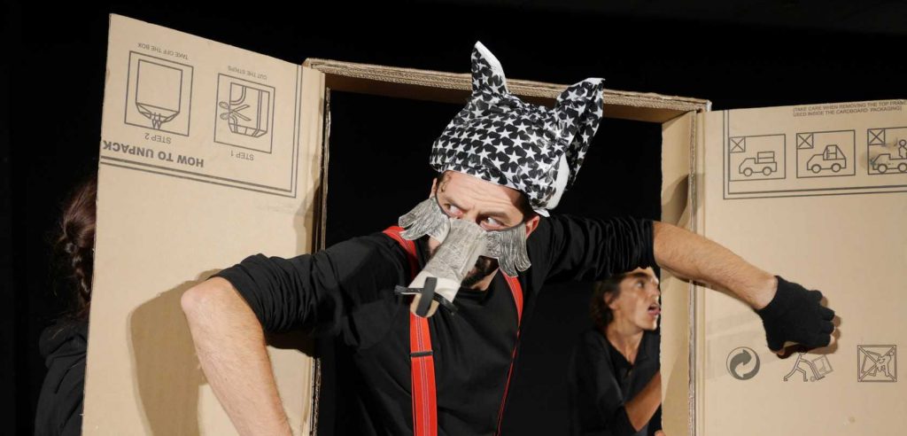 Come per magia il palcoscenico si trasforma: un uso fantasioso di oggetti e suoni fa rivivere la città, la classe, la casa, a volte dentro scatole di cartone, a volte fuori; vi si intrecciano storie e personaggi che, all’occorrenza, sono attori in carne e ossa od oggetti animati a vista in cartone e colla. Un ritmo musicale trascinante, manipolato dal vivo dagli attori come il resto dei suoni, scandisce lo spettacolo e fa parte di esso, svelando come la vera amicizia sostenga e aiuti a crescere anche i più timidi, anche i più paurosi.