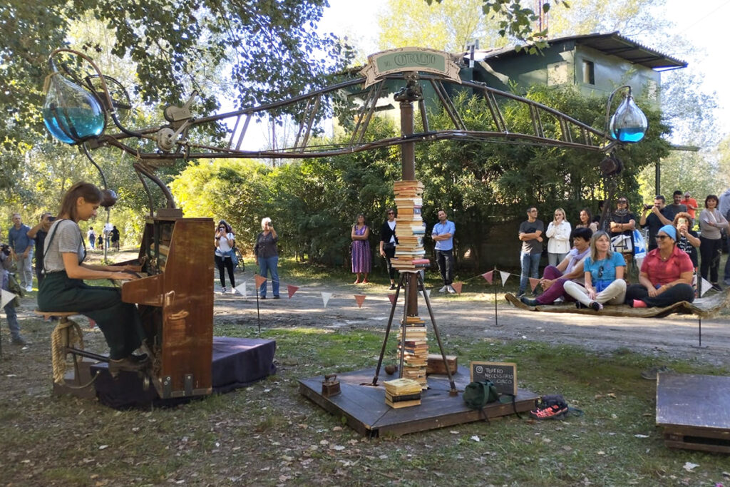 Una speciale bilancia, fatta di musica e persone, mette in equilibrio una pianista e il suo pianoforte con un tappeto che si stacca dal suolo e su cui salgono, di volta in volta, 4/5 passeggeri.
