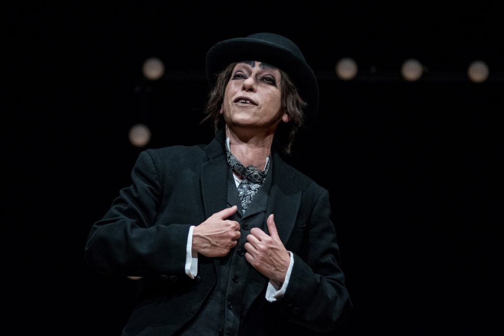 Un essere per metà scimmia e per metà uomo appare sul palcoscenico.