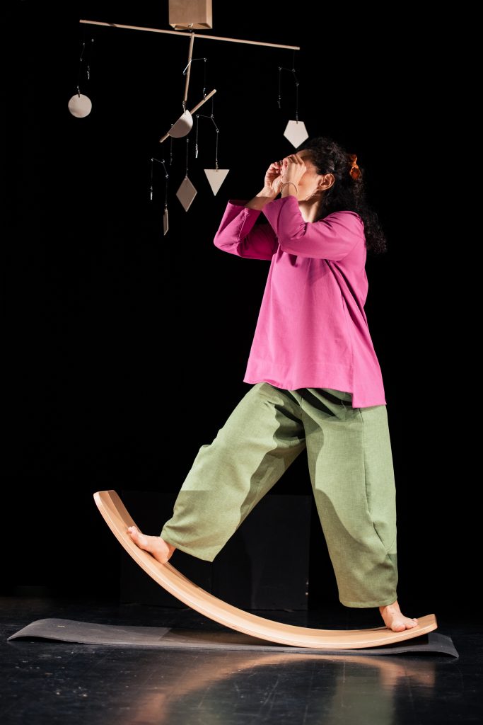 Giocando con gli elementi presenti, un personaggio scopre un mondo nuovo fatto di dis-equilibrio ed esperienze sensoriali. Attraverso i diversi giochi che via via si susseguono incontrerà quelle che noi chiamiamo emozioni. E alla fine del proprio percorso emotivo un grande mobile sarà pronto ad accogliere tutto il suo vissuto, in un perfetto disequilibrio di emozioni.