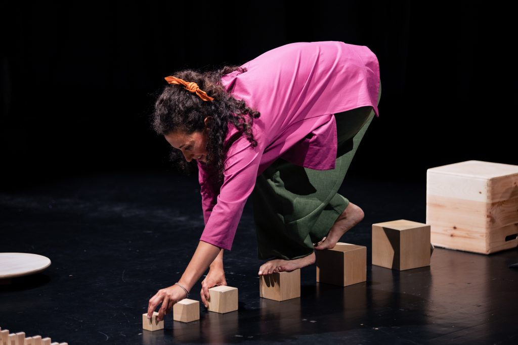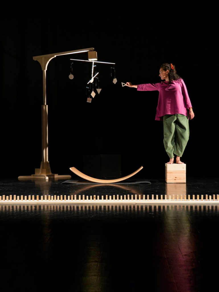 Lo spettacolo ruota intorno a una scena semplice, fatta di oggetti neutri.
