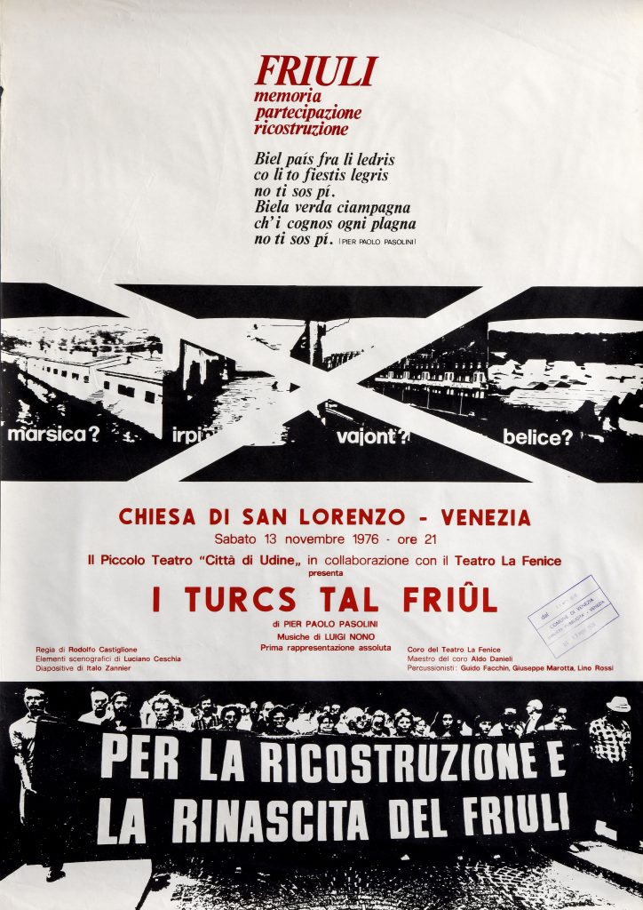 Nell’ambito del quinto Festival Luigi Nono alla Giudecca e in occasione delle celebrazioni dei cento anni della nascita dello scrittore friulano, Roberto Calabretto, esperto musicologo del Comitato scientifico della Fondazione Archivio Luigi Nono e presidente del Comitato scientifico della Fondazione Ugo e Olga Levi, ha deciso di ricostruire un pezzo importante di storia teatrale-musicale, ideando la mostra Luigi Nono, I Turcs tal Friúl di Pier Paolo Pasolini. La mostra celebra l’allestimento nella chiesa di San Lorenzo a Venezia, il 13 novembre 1976, da parte del Piccolo Teatro “Città di Udine” in collaborazione con il Teatro La Fenice di Venezia, della prima assoluta de I Turcs tal Friúl di Pier Paolo Pasolini in un’edizione curata proprio da Rodolfo Castiglione.